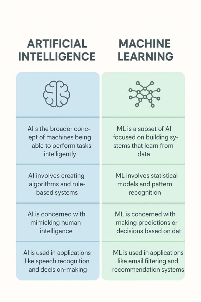Machine Learning is actually a subset of Artificial Intelligence. In ML, models learn patterns from data and improve automatically without explicit programming for each task. The more data they process, the more efficient they become. Google’s search engine exemplifies this perfectly—constantly learning and refining results based on user behavior.