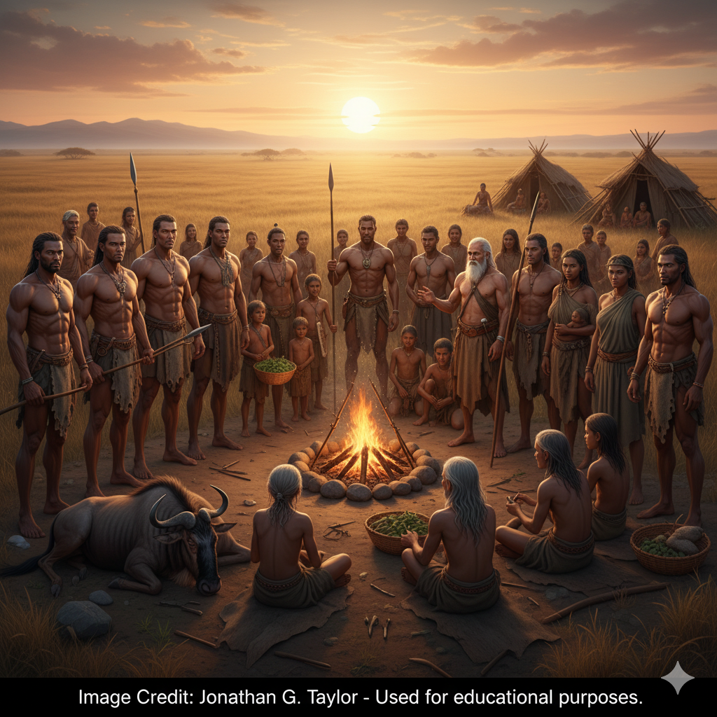The best hunter might lead during a chase, while experienced elders guided group decisions or resolved conflicts. Modern studies of the San people of southern Africa [3] and Hadza of Tanzania [4] confirm this pattern: decisions emerged through consensus, resources were shared to ensure everyone’s survival, and respect—not wealth accumulation—determined status.